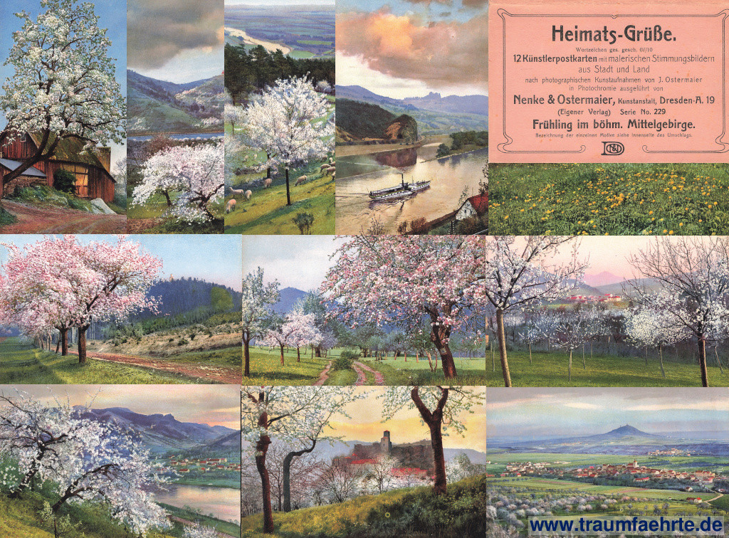 Alte Bücher etc. > Orts- & Landeskunde > EuropaHeimats-Grüße. Frühling im böhmischen Mittelgebirge. 12 Künstlerpostkarten mit malerischen Stimmungsbildern aus Stadt und Land nach photographischen Kunstaufnahmen von J. Ostermeier in Photochromie ausgeführt [ Permalink ]>>> Artikel-Nr: 39062 <<< Dresden, Nenke & Ostermeier ca. 1920 (= Photochromie Serie 229, No. 3723–3734), 12 Ansichtskarten im Original-Umschlag (3723 Ruine Schreckenstein [Střekov], 3724 Bei Salesel [Dolní Zálezly], 3725 Trebnitz und die Hasenburg [Třebenice und Hazmburk], 3726 Bei Salesel [Dolní Zálezly], 3727 Am Lobosch [Lovoš], 3728 Bei Kostenblatt [Kostomlaty pod Milešovkou], 3729 Bei Babina, 3730 Sperlingstein [Vrabinec], 3731 Am Lobosch [Lovoš], 3732 Bei Zirkowitz [Církvice], 3733 Motiv bei Topkowitz [Dobkovice], 3734 Bei Rongstock [Roztoky]) Zustand: gut erhalten Preis: 35,00 €