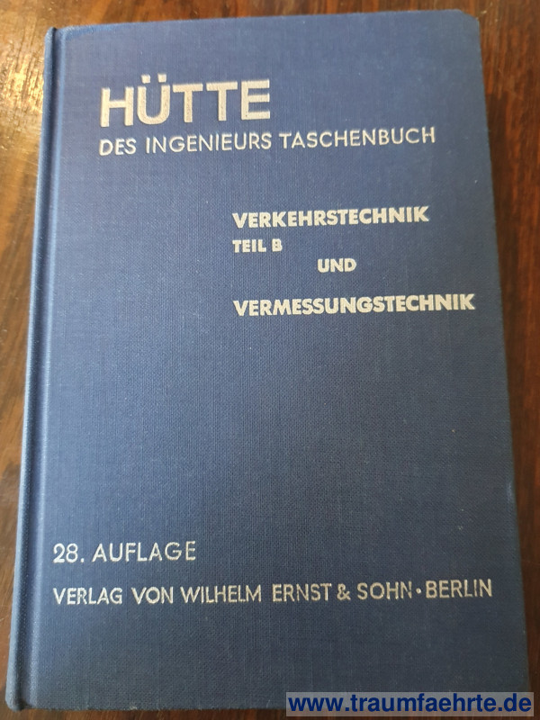 Alte Bücher etc. > Technik > AllgemeinAkademischer Verein Hütte e.V. (Hrsg.): Hütte. Des Ingenieurs Taschenbuch. Verkehrstechnik Teil B und Vermessungstechnik. (Enthält: Eisenbahntechnik.) [ Permalink ]>>> Artikel-Nr: 39072 <<< Berlin, Wilhelm Ernst 1955, 28. neubearbeitete Ausgabe, 588 S., mit zahlreichen Illustrationen, silbergeprägter OLn, 8° Zustand: Stempel auf Titelblatt, ordentliches Exemplar Preis: 9,00 €