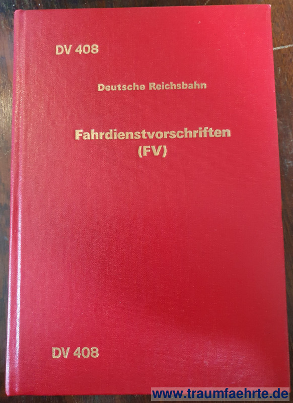 Alte Bücher etc. > Fahrzeuge > SchienenfahrzeugeMinisterium für Verkehrswesen (Hrsg.): DV 408. Deutsche Reichsbahn. Fahrdienstvorschriften (FV). Gültig ab 1. September 1990. [ Permalink ]>>> Artikel-Nr: 39076 <<< Berlin, Deutsche Reichsbahn 1989, EA, 400 S., goldgeprägter OLn., 8° Zustand: Stempel auf Titelblatt, insgesamt gut erhalten Preis: 12,00 €