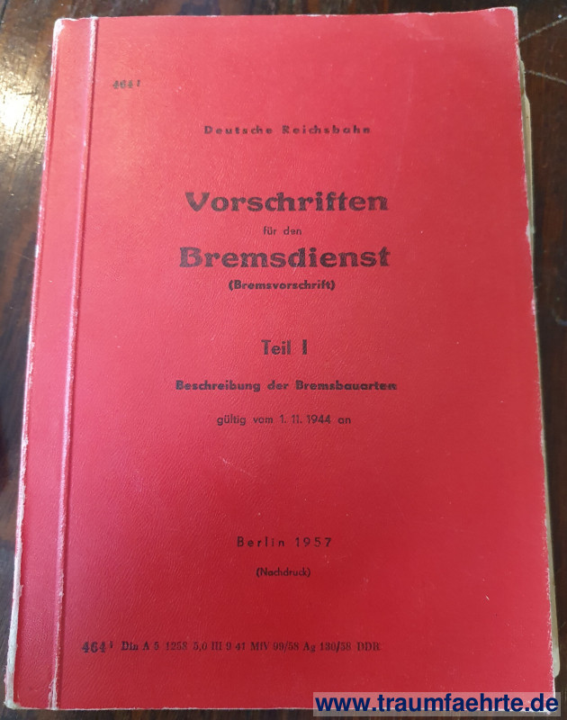Alte Bücher etc. > Fahrzeuge > SchienenfahrzeugeDeutsche Reichsbahn (Hrsg.): Vorschriften für den Bremsdienst (Bremsvorschrift), Teil I: Beschreibung der Bremsbauarten. Gültig vom 1.11.1944 an. 464 I. [ Permalink ]>>> Artikel-Nr: 39077 <<< Berlin, Deutsche Reichsbahn 1957, Nachdruck der Kriegsausgabe, 280 S., 28 Tafeln, OLn., DIN A5 Zustand: Einband etwas berieben Preis: 32,00 €