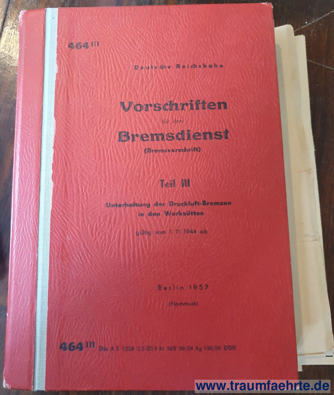 Alte Bücher etc. > Fahrzeuge > SchienenfahrzeugeDeutsche Reichsbahn (Hrsg.): Vorschriften für den Bremsdienst (Bremsvorschrift), Teil III: Unterhaltung der Druckluft-Bremsen in den Werkstätten. Gültig vom 1.11.1944 an. 464 III. [ Permalink ]>>> Artikel-Nr: 39078 <<< Berlin, Deutsche Reichsbahn 1957, Nachdruck der Kriegsausgabe, 195 S., 49 Anlagen, OLn., DIN A5 Zustand: Bund lose Preis: 28,00 €