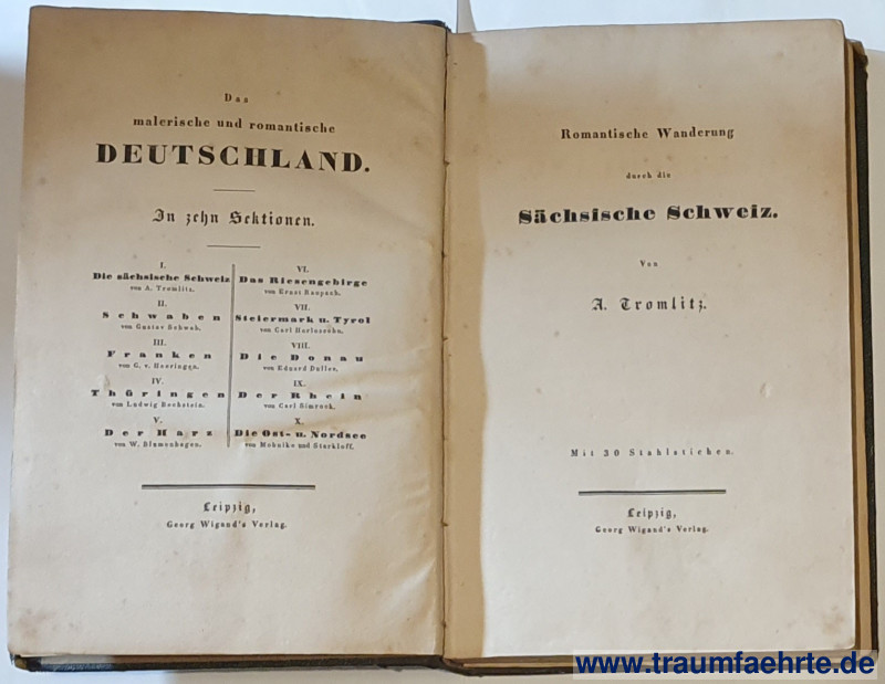 Alte Bücher etc. > SachsenTromlitz, A. / Witzleben, Karl August von: Romantische Wanderung durch die Sächsische Schweiz. [ Permalink ]>>> Artikel-Nr: 39099 <<< Leipzig, Georg Wigand (1836), 240 S., mit 28 von 30 Stahlstichen, goldgeprägter HLn. der Zeit, groß 8° Zustand: Einband leicht berieben, Papier etwas fleckig, zwei Stahlstiche fehlen Preis: 300,00 €