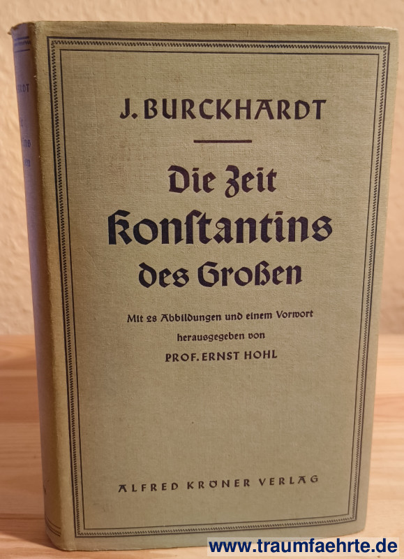 Alte Bücher etc. > Geschichte > Urgeschichte & AltertumBurckhardt, J.: Die Zeit Konstantins des Großen. [ Permalink ]>>> Artikel-Nr: 39108 <<< Stuttgart, Alfred Kröner 1939 (= Kröners Taschenausgabe Band 54), herausgegeben von Ernst Hohl, mit 28 Abbildungen, 493 S., Verlagswerbung beiliegend, OLn. mit OU. Zustand: erste drei Blätter minimal eingerissen, Schutzumschlag hinten etwas gebräunt Preis: 24,00 €