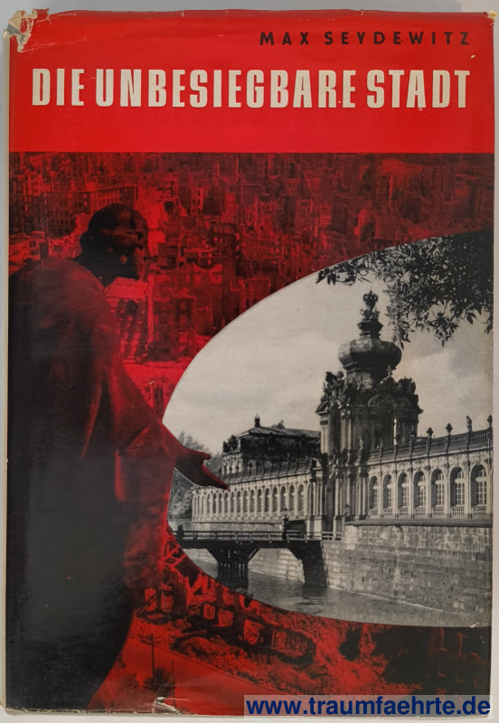 Alte Bücher etc. > SachsenSeydewitz, Max: Die unbesiegbare Stadt. Zerstörung und Neuaufbau von Dresden. [ Permalink ]>>> Artikel-Nr: 39149 <<< Kongress, Berlin 1962, 5. verbesserte Aufl., 61.–80. Tsd., mit Fotos, 387 S., OLn. mit farb. illustr. OU Zustand: Ränder des Schutzumschlags teils eingerissen, Seiten etwas gebräunt Preis: 15,00 €