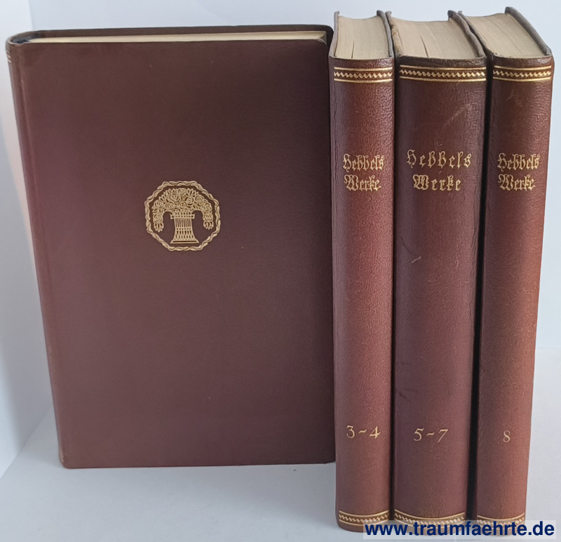 Alte Bücher etc. > Belletristik > SonstigesHebbel, Friedrich: Werke. Teile 1–8 in 4 Büchern. [ Permalink ]>>> Artikel-Nr: 39211 <<< Berlin, Deutsches Verlagshaus Bong & Co. ca. 1920, hrsg. von Theodor Poppe, mit 2 Titelbildern (Buch 1, 2) und ausklappbarem Brief (Buch 3); 334, 301, 345, 162, 329, 131, 285, 483 S., goldgeprägt., braunes OLdr.; 1. Teil: Gedichte – Mutter und Kind, 2. Teil: Judith – Genoveva – Der Diamant, 3. Teil: Maria Magdalene – Ein Trauerspiel in Sicilien – Julia – Herodes und Mariamne – Der Rubin – Michel Angelo, 4. Teil: Agnes Bernauer – Gyges und sein Ring, 5. Teil: Die Nibelungen – Demetrius, 6. Teil: Moloch – kleinere dramatische Fragmente, 7. Teil: Erzählende Werke – Erzählungen und Novellen – Autobiographisches. Reiseeindrücke, 8. Teil: Ästhetische und kritische Schriften Zustand: gut erhalten Preis: 50,00 €