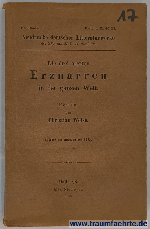 Alte Bücher etc. > Belletristik > Romane & ErzählungenWeise, Christian: Die drei ärgsten Erznarren in der ganzen Welt. Roman. [ Permalink ]>>> Artikel-Nr: 39217 <<< Halle a/S., Max Niemeyer 1878 (= Neudrucke deutscher Litteraturwerke des XVI. und XVII. Jahrhunderts, No. 12–14), XVI, 228 S., OBrosch.; Nachdruck der Ausgabe von 1673, Original-Titel nach Einleitung: Die drey aergsten Erz-Narren In der ganzen Welt, Auß vielen Naerrischen Begebenheiten hervorgesucht, und Allen Interessenten zu besserem Nachsinnen übergeben, durch Catharinum Civilem. Anietzo von denen vielfaeltigen Druckfehlern gereinift und verbessert. Zustand: Broschur (Rücken, Vorderseite) und Titelblatt beschriftet, einzelne Seiten unaufgeschnitten Preis: 10,00 €