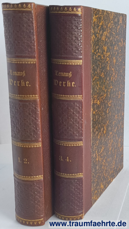 Alte Bücher etc. > Belletristik > Gedichte & DramenLenau, Nikolaus: Sämtliche Werke in vier Bänden (in 2 Büchern). [ Permalink ]>>> Artikel-Nr: 39232 <<< Stuttgart, J. G. Cotta’sche Buchhandlung / Gebrüder Kröner Verlagsbuchhandlung o.J., komplett, mit Titelbild und einer biographischen Einleitung von Hrsg. Anastasius Grün; 240, 207, 191, 260 S., goldgeprägt. OHLdr. 1. Band: Gedichte. Erstes Buch. 2. Band: Gedichte. Zweites Buch. Dichterischer Nachlaß. Lyrische Nachlese. 3. Band: Größere lyrisch-epische Dichtungen. Klara Hebert. – Die Marionetten. – Anna. – Mischka. – Johannes Biska. – Faust. 4. Band: Savonarola. – Die Albigenser. – Dramatischer Nachlass. Don Juan. – Helena. Zustand: vereinzelte Bleistiftanstreichungen im Inhaltsverzeichnis Preis: 24,00 €