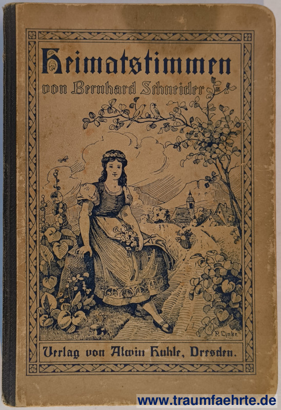 Alte Bücher etc. > Musik > Liederbücher & OperntexteSchneider, Bernhard (Hrsg.): Heimatstimmen. Eine Sammlung alter und neuer, geistlicher und weltlicher Volksweisen und Kunstgesänge in dreistimmiger Bearbeitung. Ausgabe A: 260 Gesänge für die Chor- und Oberklassen der Volksschule. [ Permalink ]>>> Artikel-Nr: 39251 <<< Dresden, Alwin Kuhle 1912, 4. Aufl. (16.–20. Tsd.), 288 S. illustr. OHLdr. Zustand: Einband und einige wenige Seiten etwas fleckig Preis: 15,00 €