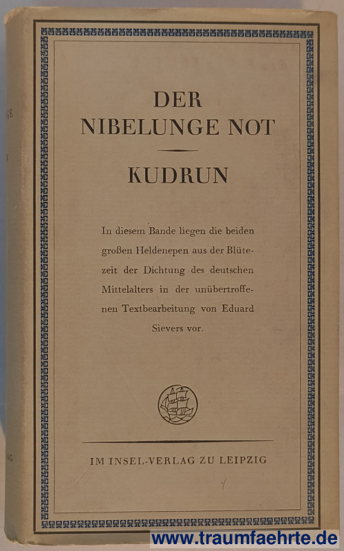 Alte Bücher etc. > Belletristik > Gedichte & DramenSievers, Eduard (Hrsg.): Der Nibelunge Not. Kudrun. [ Permalink ]>>> Artikel-Nr: 39257 <<< Leipzig, Insel 1955, (Sark 1191), 14.–17. Tsd., 624 S., goldgeprägt., blaues OLn. mit mehrfarb. OU, kl. 8° Zustand: Schutzumschlag minimal bestoßen Preis: 14,00 €