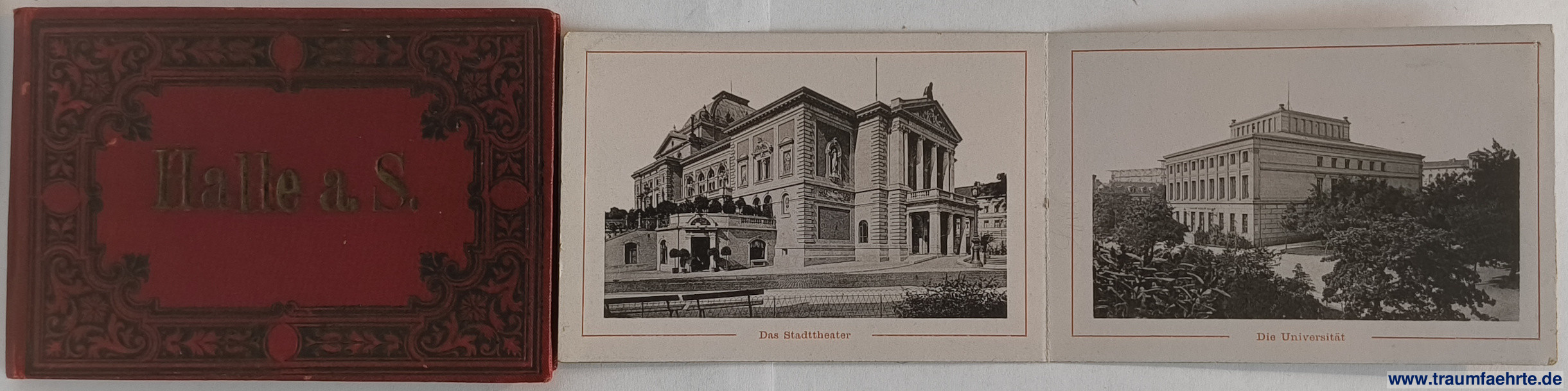 Alte Bücher etc. > Orts- & Landeskunde > DeutschlandHalle a. S. [ Permalink ]>>> Artikel-Nr: 39310 <<< o.A., Leporello mit 12 Ansichten: 1.) Marktplatz. Marienkirche und Rother Turm. 2.) Marktplatz. Altes und neues Rathaus. 3.) Das Stadttheater. 4.) Die Universität. 5.) Klinische Anstalten. 6.) Francke-Stiftung. 7.) Königl. Oberbergamt. 8.) Der Bahnhof. 9.) Die Moritzburg. 10.) Burg Giebiehenstein. 11.) Die Peissnitz. 12.) Saalschlossbrauerei.; roter, schwarz dekorierter OLn., Quer-12° Zustand: etwas verschmutzt, Nr. 3–4 und 5–12 separat, Einband geschwärzt Preis: 24,00 €