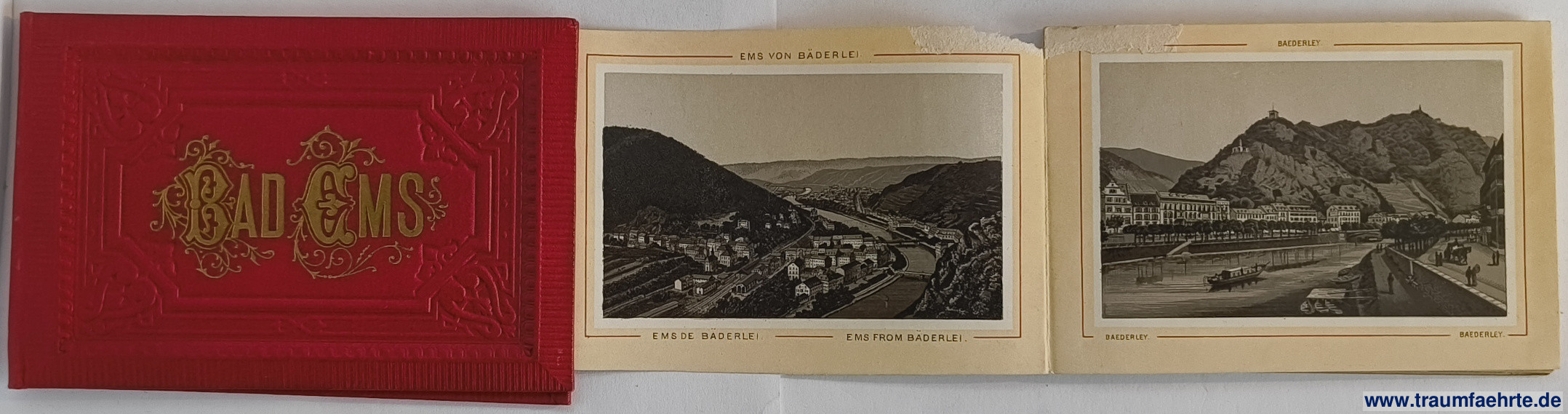 Alte Bücher etc. > Orts- & Landeskunde > DeutschlandBad Ems. [ Permalink ]>>> Artikel-Nr: 39311 <<< Eisenach, W. Schütz o.J., Leporello mit 23 Abbildungen auf 21 Segmenten (eine über zwei Segmente, 6 auf halben Segment): 1.) Totalansicht, 2.) Ems von Bäderlei, 3.) Baederley, 4.) Altes Kurhaus, 5.) Kurhaus, 6.) Kurgarten, 7.) Kursaal, 8.) Wandelbahn, 9.) Ems mit Villen, 10.) Kesselbrunnen, 11.) Kraehnchenbrunnen, 12.) katholische Kirche, 13.) russische Kirche, 14.) Nassau-Panorama, 15.) Schloss Schaumburg, 16.) Burg Langenau und Kloster, 17.) Burg Lahneck und Niederlahnstein, 18.) Capellen und Schloss Stolzenfels, 19.) Coblenz, 20.) National-Denkmal auf dem Niederwald, 21.) Malbergbahn, 22.) Stationshaus und Weiher auf dem Hohen Malberg, 23.I) Kaiser Wilhelm I.-Denkmal; goldgeprägt. roter OLn., Quer-12° Zustand: Segment 3–4 oben leicht beschädigt (kein Bild- oder Textverlust) Preis: 28,00 €