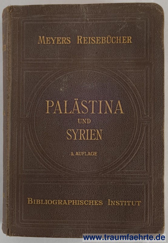 Alte Bücher etc. > Reiseführer > SonstigesPalästina und Syrien. [ Permalink ]>>> Artikel-Nr: 39319 <<< Leipzig, Bibliographisches Institut 1913 (= Meyers Reisebücher), 5. Aufl., mit (oft farb. lithogr.) 10 Karten, 15 (von 17) Plänen und 2 Abbildungen, 307 S., 40 nummerierte S. Werbung, goldgeprägt. braunes OLn., kl. 8° Zustand: Einband etwas berieben, vereinzelt Eckknicke hinten, Pläne auf S. 215 u. 237 fehlen Preis: 125,00 €
