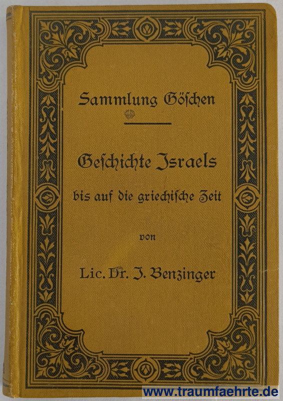 Alte Bücher etc. > Religion > JudaicaBenzinger, J.: Geschichte Israels bis auf die griechische Zeit. [ Permalink ]>>> Artikel-Nr: 39325 <<< Leipzig, G. J. Göschen’sche Buchhandlung 1904 (= Sammlung Göschen), 158 S., 8 Blatt Verlagswerbung, OLn., kl. 8° Zustand: ordentliches Exemplar mit Bleistiftanstreichungen Preis: 9,00 €