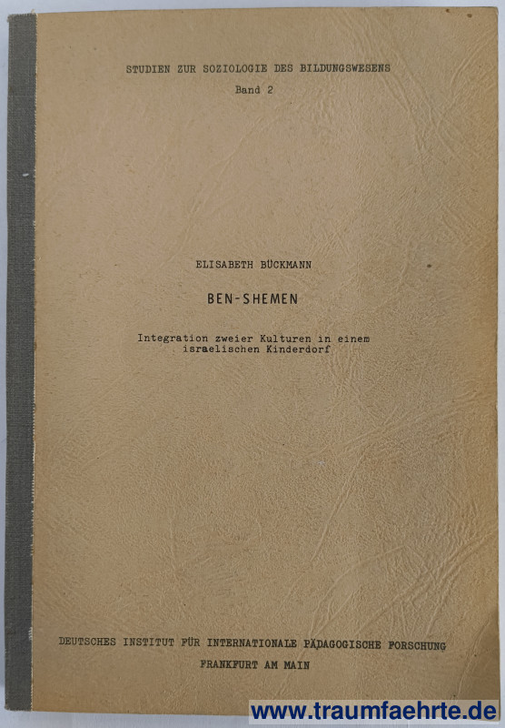 Alte Bücher etc. > Religion > JudaicaBückmann, Elisabeth: Ben-Shemen. Integration zweier Kulturen in einem israelischen Kinderdorf. [ Permalink ]>>> Artikel-Nr: 39327 <<< Frankfurt am Main, Deutsches Institut für internationale pädagogische Forschung 1965 (= Studien zur Soziologie des Bildungswesens Band 2), 170 S., HLn. Zustand: Einbanddeckel unten rechts etwas geknickt, sonst schönes Exemplar Preis: 38,00 €