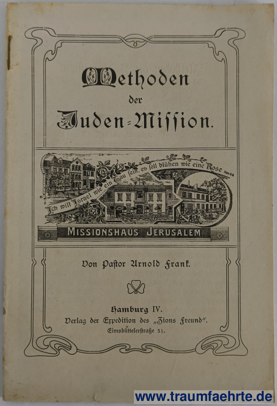 Alte Bücher etc. > Religion > JudaicaFrank, Arnold: Methoden der Juden-Mission. [ Permalink ]>>> Artikel-Nr: 39338 <<< Hamburg, Expedition des „Zions Freund“ ca. 1920, 24. S., OBro., illustriert mit dem „Missionshaus Jerusalem“ Zustand: Klammern etwas angerostet, kleiner Riss unten Preis: 75,00 €