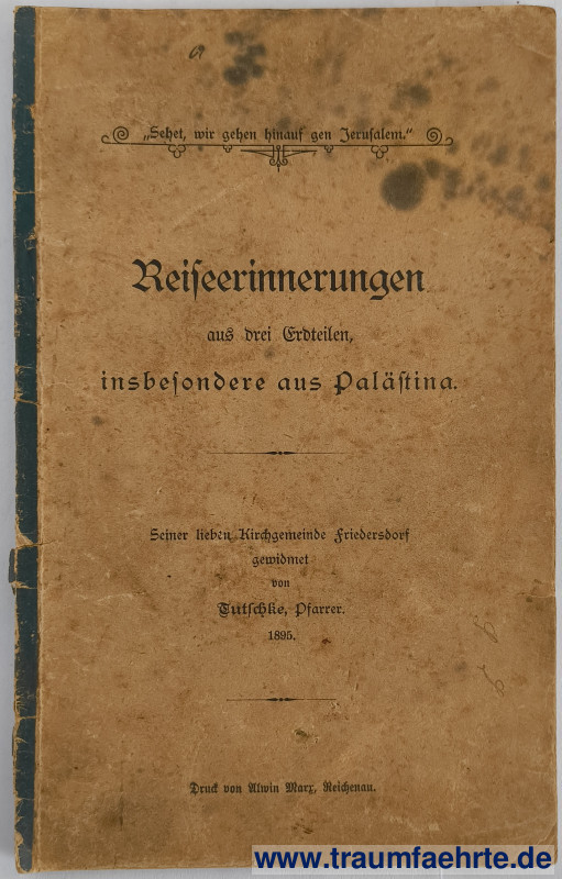 Alte Bücher etc. > Reisebeschreibungen > SonstigesTutschke, Pfarrer: Reiseerinnerungen aus drei Erdteilen, insbesondere aus Palästina. [ Permalink ]>>> Artikel-Nr: 39340 <<< Reichenau, Alwin Marx (Druck) 1895, 60 S., OBro. Zustand: Einband fleckig, Seiten gebräunt und einzelne stockfleckig, minimal randrissig Preis: 90,00 €