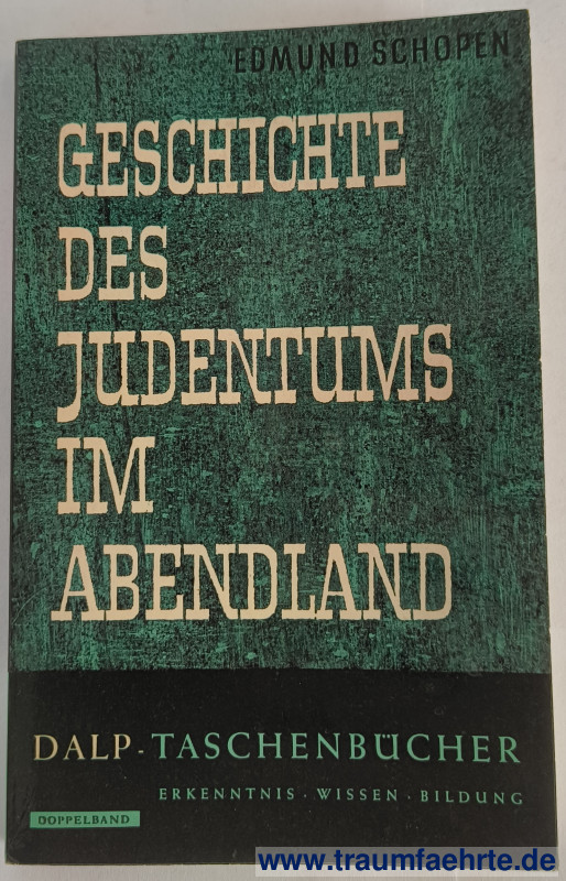 Alte Bücher etc. > Religion > JudaicaSchopen, Edmund: Geschichte des Judentums im Abendland. [ Permalink ]>>> Artikel-Nr: 39341 <<< Bern, Francke 1961 (= DALP-Taschenbücher Band 357D), 160 S., mehrfarb. OBro. Zustand: Seiten etwas gebräunt Preis: 4,00 €