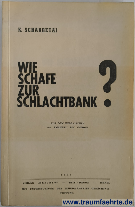 Alte Bücher etc. > Religion > JudaicaSchabbetai, K.: Wie Schafe zur Schlachtbank? [ Permalink ]>>> Artikel-Nr: 39352 <<< Beit-Dagon, Keschew 1965, 1. deutsche Ausgabe, 91 S., OBro., gr. 8°; enthält: Vorwort. Die Feigheitslegende. Auch die Rebellion unterliegt Gesetzen. „…und wirst unsinnig werden.“ Von Dreien, die geheiligt wurden. Nachwort des Übersetzers. Zustand: Einband minimal gebräunt, sonst schönes Exemplar Preis: 48,00 €