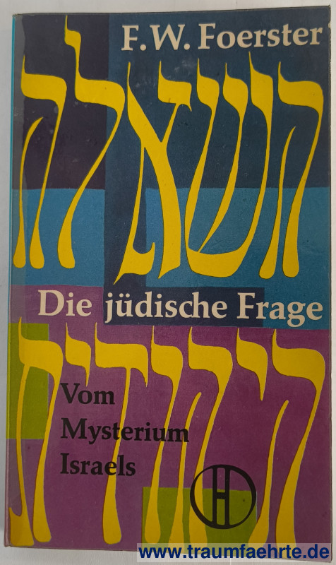 Alte Bücher etc. > Religion > JudaicaFoerster, Friedrich Wilhelm: Die jüdische Frage. [Vom Mysterium Israels.] [ Permalink ]>>> Artikel-Nr: 39361 <<< Basel, Herder 1959 (= Herder-Bücherei Band 55), 139 S., 1 Blatt Verlagswerbung, farb. illustr. OBro. Zustand: Seiten gebräunt Preis: 6,00 €