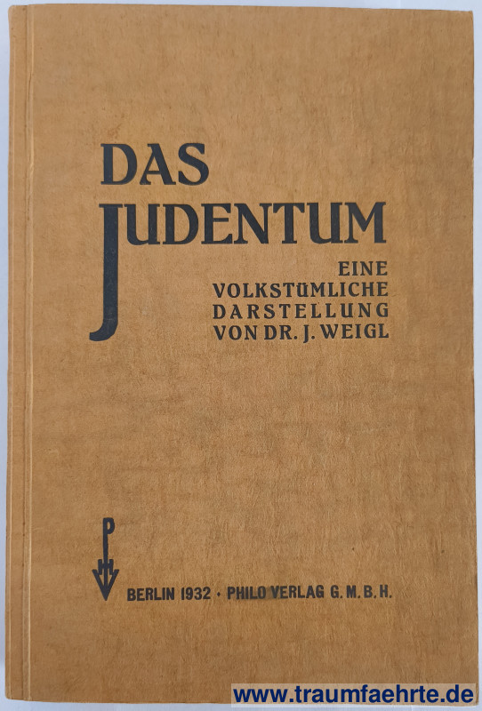 Alte Bücher etc. > Religion > JudaicaWeigl, J.: Das Judentum. Eine volkstümliche Darstellung. [ Permalink ]>>> Artikel-Nr: 39370 <<< Berlin, Philo 1932, Notizen und Rezensionskarte des Verlages beiliegend, 321 S., OBro. Zustand: Seitenränder und erste Seiten minimal stockfleckig Preis: 32,00 €