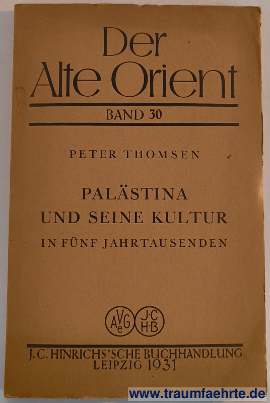 Alte Bücher etc. > Religion > JudaicaThomsen, Peter: Palästina und seine Kultur in fünf Jahrtausenden. Nach den neuesten Ausgrabungen und Forschungen dargestellt. [ Permalink ]>>> Artikel-Nr: 39391 <<< Leipzig, J. C. Hinrichs 1931 (= Der Alte Orient Band 30), mit Textzeichnungen und Fotos, 120 S., OBro., gr. 8° Zustand: Einband etwas bestoßen, Einbandrand etwas geschwärzt Preis: 12,00 €