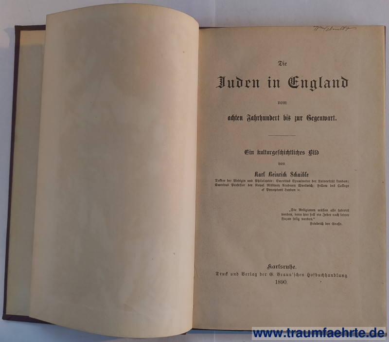 Alte Bücher etc. > Religion > JudaicaSchaible, Karl Heinrich: Die Juden in England vom achten Jahrhundert bis zur Gegenwart. [ Permalink ]>>> Artikel-Nr: 39415 <<< Karlsruhe, G. Braun 1890, 133 S., 1 S. Verlagswerbung, Ln. Zustand: Seiten gebräunt Preis: 120,00 €