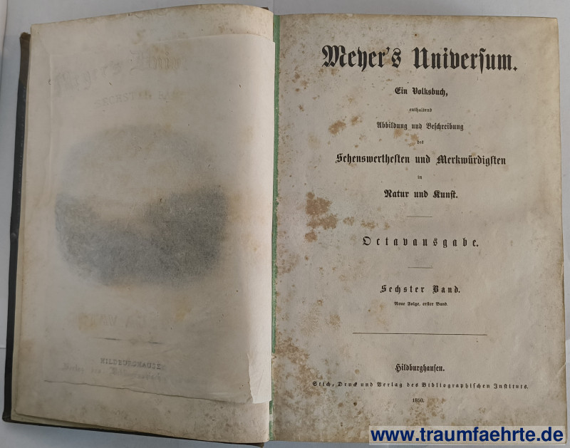 Alte Bücher etc. > Orts- & Landeskunde > SonstigesMeyer, J.: Meyer’s Universum. Ein Volksbuch enthaltend Abbildung und Beschreibung des Sehenswerten und Merkwürdigen in Natur und Kunst. Octavausgabe. Neue Folge, Band 1–3 (6.–8. Band) in 1 Buch. [ Permalink ]>>> Artikel-Nr: 39418 <<< Hildburghausen, Bibliographisches Institut 1850 (Band 1 bzw. 6), 1860 (Band 2 bzw. 7), 1861 (Band 3 bzw. 8), mit 128 Stahlstichen (einschließlich 3 Titel-Stahlstiche), 3 Inhaltsverzeichnissen; 159, 163, 171 S., nachgebunden in HLn., gr. 8°; die Stiche im Einzelnen: [Band 1 bzw. 6] 1. Der Bosporus (Titelstich), 2. Der Himmalajah, 3. Chateau Tancarville, 4. Hohen-Salzburg, 5. Das Großherzogl. Schloss in Schwerin, 6. Ruinen von Ettaia, 7. Louisville, 8. Die Ufer des Tsad, 9. Kasan, 10. Pierre Pertuis bei Tavannes (Schweiz), 11. Orleans, 12. An der Mündung des Rio de las Lajas, 13. Laxenburg, 14. Bad Rǒznau in Maehren, 15. Wilhelmsthal: Schloss und Park bei Eisenach, 16. Umgegend von Cumä, 17. Bad Pfeffers (Schweiz), 18. Der Hradschin in Prag, 19. Toulon, 20. Schloss Prunn im Altmühlthale (Bayern), 21. Die Jungfrau, 22. Basel, 23. Die Arctic-Gletscher (Melville Bay), 24. Die Stone Walls (oberer Missouri), 25. Die Höhle von Paros, 26. Die grosse Moschee in Brussa, 27. Sanct Stephan in Wien, 28. Kastel und Moschee der Semiramis, 29. Das Appenzeller Wildkirschlein (Schweiz), 30. Zarskoe, 31. Astor Haus (New York), 32. Sorrent, 33. Irkutsk, 34. Der Hundskogel am Hitersee, 35. Griechische Bautrümmer auf Candia, 36. Constanz, 37. Der Toppö-Fall (Göta-Canal), 38. Lago d'Averno, 39. Schloss und Brücke von Pau, 40. Der Bischofs-Palast zu Durham in England, 41. Luzern, 42. Haus des Sandwirt's Hofer im Tyrol, [Band 2 bzw. 7] 43. Prado in Madrid (Titelstich), 44. Misda: Eine Oase in der Sahara, 45. Lauterbrunnenthal in der Schweiz, 46. Der große Geyser am Hekla, 47. L'Arc de L'Étoile in Paris, 48. Der Sonnentempel zu Baalbeck, 49. Die Elbe gegen Schandau, dem Winterberg und Böhmen vom Linienstein aus, 50. Schandau an der Elbe, 51. Kloster Mafra in Portugal, 52. Sultan Mahomed Shah's Mausoleum in Bejapore, 53. Hohentwiel, 54. Kloster des Ivan Velekoi in Moskau, 55. Das Königliche Schloss in Amsterdam, 56. Der Felsen-Tempel zu Ellora, 57. Ithaca, 58. Gleichen und Mühlberg in Thüringen, 59. Heliopolis, 60. Frauenstein, 61. Trenton Falls, 62. Aachen, 63. Am Arkansas, 64. Vincennes near Paris, 65. Isola Bella and the Lago Maggiore in Italy, 66. Hobartown Vandiemensland, 67. Castle Johannisberg on the Rhine: Country-seat of the Prince Metternich, 68. Die Schaedel-Pyramide bei Tebah in Africa, 69. Partie im Richmond-Park bei London, 70. Trébizonde, 71. Der Münster in Freiburg, 72. Kiew, 73. Schloss Amboise an der Loire, 74. Nürnberg (die Burg), 75. Das Forum in Rom, 76. Die Riesenburg, 77. Durham, 78. Charleston (Verein. Staaten v. N.A.), 79. Festung Peterwardeln an der Donau in Sirmien, 80. Die Königshütte in Schlesien, 81. Patent-Office in Washington, 82. Der Inselsberg, 83. Palast Barbarigo und Pisani in Venedig, 84. Auch in den Pyrenaeen, 85. Die Mammuths-Höhle (Mammoth-Cave) in Kentucky, [Band 3 bzw. 8] 86. Hindu-Tempel zu Ghazipore (Titelstich), 87. Zwingli's Haus, 88. Am Kai (Levée) in New-Orleans, 89. Die Basteifelsen bey Rathen in der sächsischen Schweiz, 90. Detter Warra der Höhlentempel in Indien, 91. Der Eisenbahn-Viaduct über die Lagunen nach Venedig, 92. Lemberg, 93. Chateau de Versailles, 94. Der Parnassus (Griechenland), 95. Bucht von Bajae (Neapel), 96. San Francisco im November 1848, 97. San Francisco, 98. Roma in der Türkey, 99. Der Mont-Rosa von Vispach aus, 100. Der Vesta-Tempel in Rom, 101. Kronstadt, in der Ferne Petersburg, 102. Sunderland in Durham (England), 103. Der Hudson bei Newburg, 104. Schloss Neuilly bei Paris, 105. Burg Landeck in Tyrol, 106. Baltimore, 107. Warkworth-Castle, Northumberland, 108. Tintellust (Afrika), 109. Schloss und Kloster Illock in Ungarn, 110. Ivrea (Italien), 111. Süd-Westliche Mündung des Mississippi, 112. Rotterdam, 113. Schloss Friedland in Böhmen, 114. Der Thorstein (Thüringen), 115. Die Splügen-Strasse, 116. Kansas, 117. Mahabalipoor, 118. Alt-Boyneburg (oder Alt-Boimburg), 119. Ajaccio, 120. Marathon (Griechenland), 121. Stolzenfels am Rhein, 122. Schloss Weideneck Nieder-Oesterreich, 123. Bordeaux, 124. Cetara (Bay von Salerno), 125. Die Domkirche in Magdeburg, 126. Wittenberg an der Elbe, 127. Schloss Kurburg mit dem Ortles (in Tyrol), 128. Kirche St German d'Auxerre in Paris Zustand: Einband berieben und mit Wasserfleck (einschließlich auf Innendeckel), Seiten (einschließlich der Stiche) etwas stockfleckig, Widmung von 1864 auf Vorsatz Preis: 680,00 €