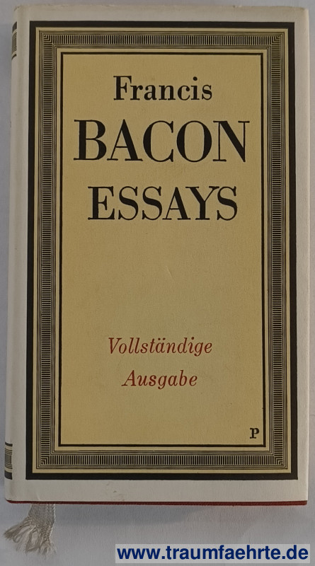 Alte Bücher etc. > Belletristik > SonstigesBacon, Francis: Essays. Vollständige Ausgabe. [ Permalink ]>>> Artikel-Nr: 39437 <<< Leipzig, Dieterich’sche Verlagsbuchhandlung 1979 (= Sammlung Dieterich Band 71), 4. Aufl., mit Titelbild, 284 S., goldgeprägt. roter OLn. mit farb. OU, kl. 8° Zustand: Schutzumschlag oben leicht berieben, sonst schönes Exemplar Preis: 9,00 €