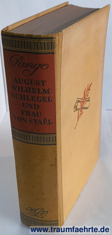 Alte Bücher etc. > Belletristik > Romane & ErzählungenPange, Pauline Gräfin de: August Wilhelm Schlegel und Frau von Staël. Eine schicksalhafte Begegnung. Nach unveröffentlichten Briefen erzählt. [ Permalink ]>>> Artikel-Nr: 39460 <<< Hamburg, H. Goverts 1940, 5. Aufl., deutsche Ausgabe von Willy Grabert, mit Stahlstich als Titelbild, 496 S., mehrfarb., von Hans Bohn illustr. OHLn., gr. 8° Zustand: Band etwas gewölbt, Name auf Vorsatz, Seiten gebräunt Preis: 8,00 €