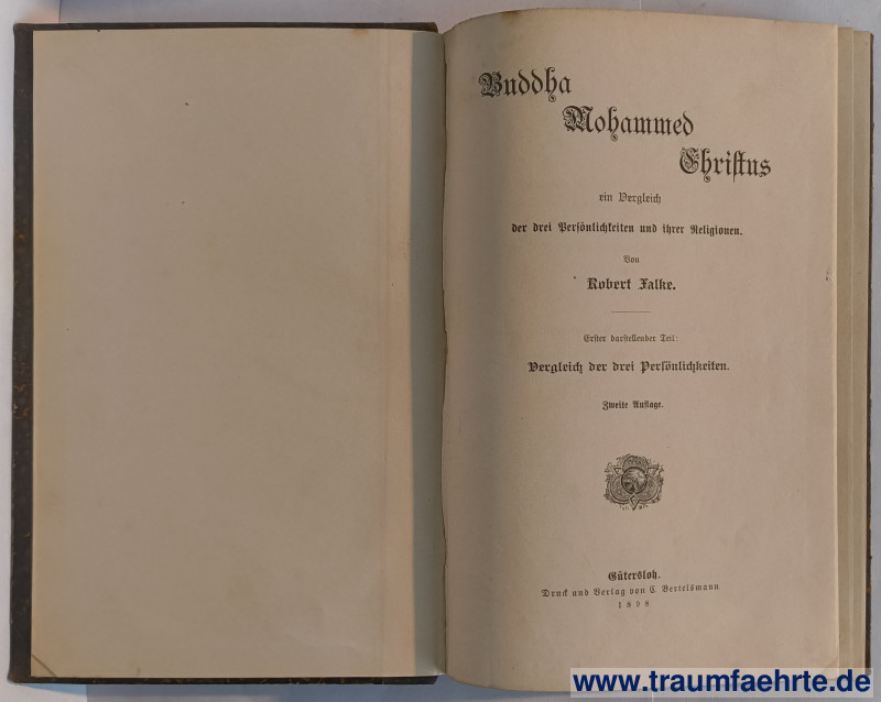 Alte Bücher etc. > Religion > AllgemeinesFalke, Robert: Buddha. Mohammed. Christus. Ein Vergleich der drei Persönlichkeiten und ihrer Religionen. Erster darstellender Teil: Vergleich der drei Persönlichkeiten. [ Permalink ]>>> Artikel-Nr: 39487 <<< Gütersloh, C. Bertelsmann 1898, 2. Aufl., 216 S., goldgeprägt. HLn. Zustand: Einband etwas berieben, Seiten gebräunt und teilweise etwas fleckig, Bleistiftanstreichungen Preis: 38,00 €