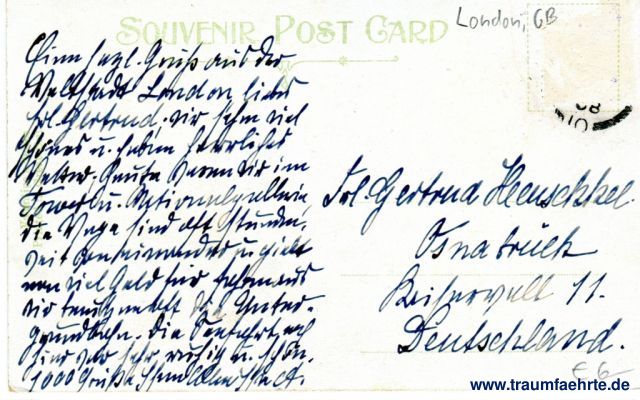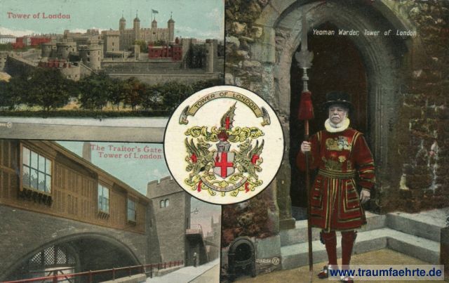 – Details – Jahr: vor 1945 Status: gelaufen, Briefmarke entfernt Beschriftung vorne: Tower of London, domine dirige nos, Tower of London, The Traitor's Gate. Tower of London, Yeoman Warder, Tower of London Beschriftung hinten: Souvenir Post Card, printed in Great (Britain) Stempel: (...) Hinweis: