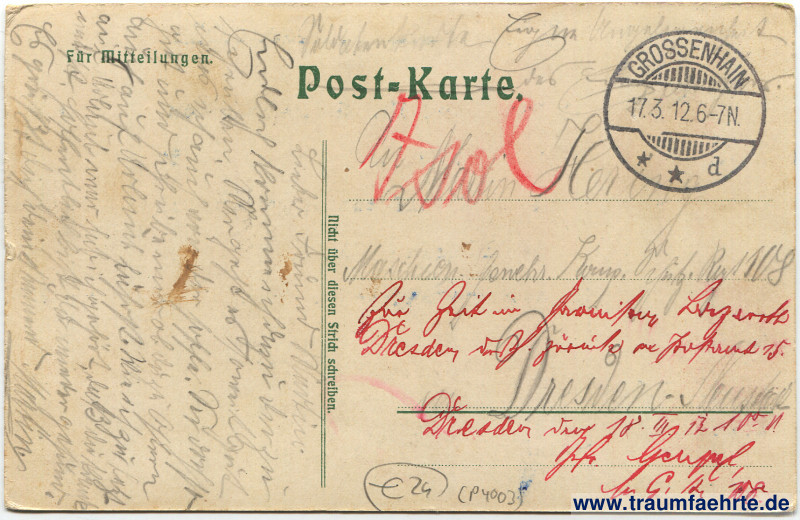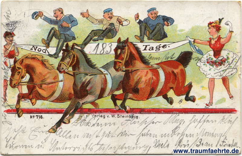– Details – Jahr: ca. 1910 Status: gelaufen ohne Briefmarke (Feldpost), 1912 Beschriftung vorne: Noch … Tage. No. 716. Verlag v. W. Steinberg. Beschriftung hinten: Post-Karte. Für Mitteilungen. Nicht über diesen Strich schreiben. Stempel: Grossenhain. * * d, 17.3. 6–7 N. Hinweis: