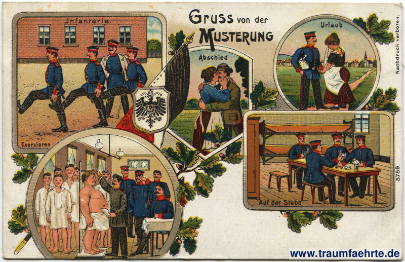 Beschriftung vorne: Gruss von der Musterung. Infanterie. Exerzieren. Abschied. Urlaub. Auf der Stube. 5759, Nachdruck verboten.