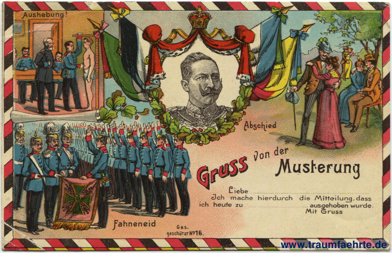 Beschriftung vorne: Gruss von der Musterung, Aushebung, Abschied, Fahneneid, Liebe … Ich mache hierdurch Mitteilung, dass ich heute zu … ausgehoben wurde. Mit Gruss, Ges. geschützt, No. 16.