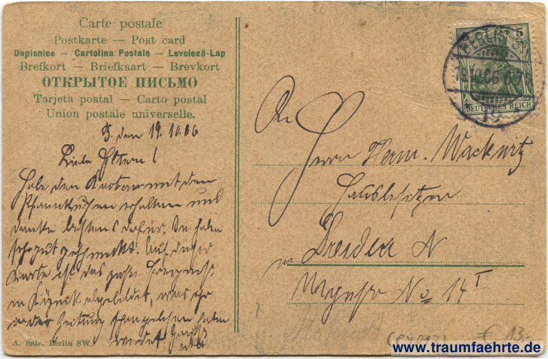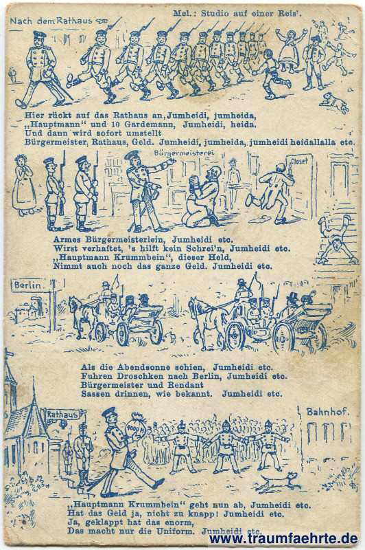 – Details – Jahr: ca. 1905 Status: gelaufen 1906 Beschriftung vorne: Nach dem Rathaus. Mel.: Studio auf einer Reis'. Hier rückt auf das Rathaus an, Jumheidi, jumheida, / „Hauptmann“ und 10 Gardemann, Jumheidi, heida. / Und dann wird sofort umstellt / Bürgermeister, Rathaus, Geld. Jumheidi, jumheida, jumheidi heidallalla etc. // Armes Bürgermeisterlein, Jumheidi etc. / Wirst verhaftet, 's hilft kein Schrei'n, Jumheidi etc. / „Hauptmann Krummbein“, dieser Held, / Nimmt auch noch das ganze Geld. Jumheidi etc. // Als die Abendsonne schien, Jumheidi etc. / Fuhren Droschken nach Berlin, Jumheidi etc. / Bürgermeister und Rendant / Sassen drinnen, wie bekannt. Jumheidi etc. // „Hauptmann Krummbein“ geht nun ab, Jumheidi etc. / Hat das Geld ja, nicht zu knapp! Jumheidi etc. / Ja, geklappt hat das enorm, / Das macht nur die Uniform. Jumheidi etc. Bürgermeisterei, Closet, Berlin., Rathaus, Bahnhof. 4000 M. Beschriftung hinten: Carte postale, Postkarte – Post card, Dopisnice – Cartolina Postale – Levelezö-Lap, Brefkort – Briefkaart – Brevkort, ОТКРЫТОЕ ПИСЬМО, Tarjeta postal – Carto postal, Union postale universelle. A. Sala, Berlin SW. Stempel: Berlin SW, * 19 *, 19.10.06. 6–7[…] Hinweis: