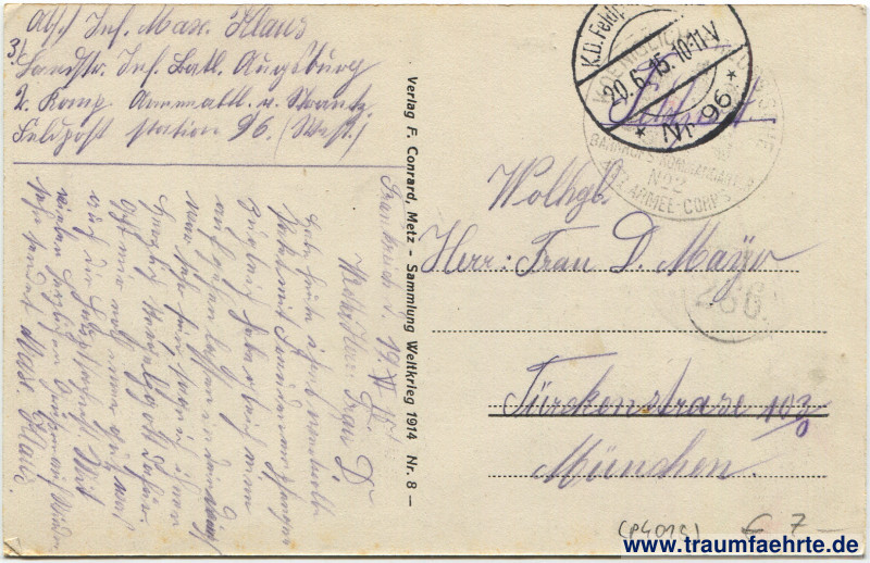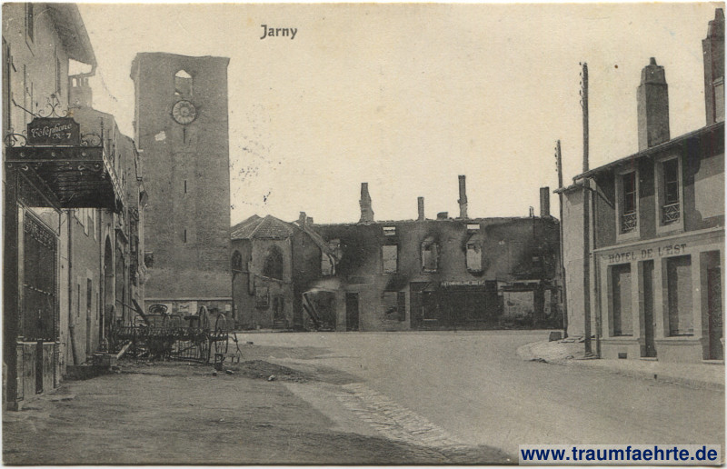 – Details – Year: 1914 Postal state: postally used without stamp (military mail), 1915 Inscription front: Jarny, Telephone No 7, Hôtel de l'Est Inscription back: Verlag F. Conrad, Metz – Sammlung Weltkrieg 1914 Nr. 8 – Postmark(s): K. D. Feldp[ostexp.] Nr. 96, 20.6.15 10–11V.; Königlich-Preussische Bahnhofs-Kommandatur No. 2 […] Armee-Corps; (286) Please note: