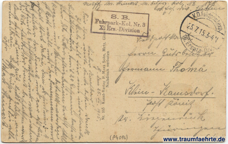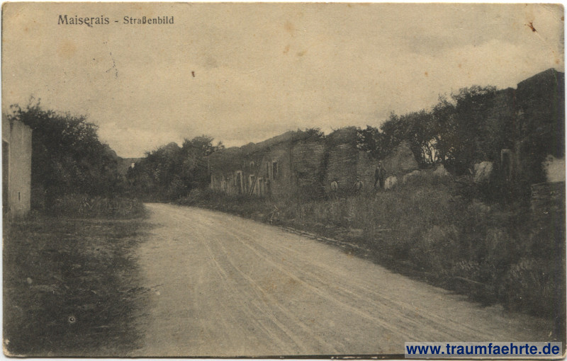 – Details – Year: 1914/15 Postal state: postally used without stamp (military mail), 1915 Inscription front: Maiserais – Straßenbild Inscription back: Nr. 165 Kunst-Verlag P. Maas Sohn, Metz, Gisorstr. Nachdruck verboten. Postmark(s): K. D. Feldpostexp., 10. Ersatz-Div., 25.7.15. 3–4 N; S. B. Fuhrpark-Kol. Nr. 3, X. Ers.-Division Please note: