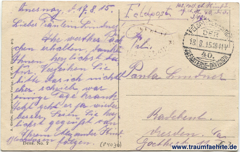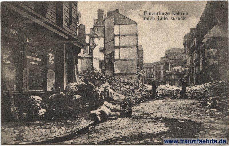 – Details – Jahr: ca. 1915 Status: gelaufen ohne Briefmarke (Feldpost), Beschriftung vorne: Flüchtlinge kehren nach Lille zurück, Boss Pale Ale, Bière Motte Cordonnier [d' Armentières], […] Pils, […] Beschriftung hinten: Dess. No. 7, A. Grohs, Illustrations-Verlag, S.W. 68, Zimmerstr. 48 b Stempel: Feldpostexpedition der 40. Infanteriedivision, 18.8.15. 10–11 V.; […] Hinweis: