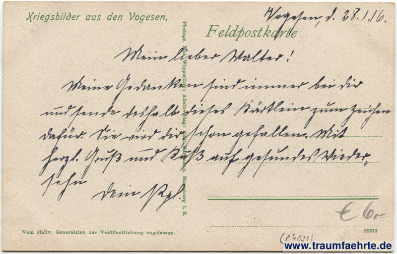 – Details – Jahr: ca. 1915 Status: ungelaufen Beschriftung vorne: Kriegsbilder aus den Vogesen. Strassenscene in Colroy-la-Grande. Beschriftung hinten: Feldpostkarte, Kriegsbilder aus den Vogesen. Photogr. Max Wipperling; Alleinverlag: Emil Hartmann, Strassburg i. E. Vom stellv. Generalstab zur Veröffentlichung zugelassen. 28513 Stempel: keine Hinweis: