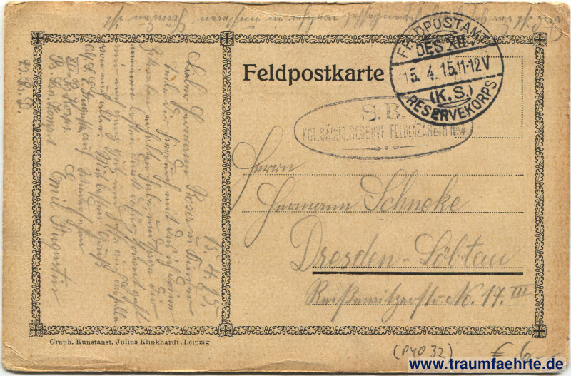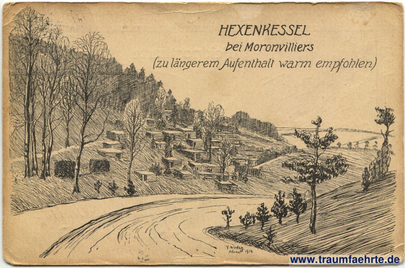 – Details – Jahr: 1914/15 Status: gelaufen ohne Briefmarke (Feldpost), 1915 Beschriftung vorne: Hexekessel bei Moronvilliers (zu längerem Aufenthalt warm empfohlen) Beschriftung hinten: Feldpostkarte, Graph. Kunstanst. Julius Klinkhardt, Leipzig Stempel: Feldpostamt (K.S.) Reservekorps, 15.4.15. 11–12 V.; S. B. Kgl. Sächs. Reserve-Feldlazarett No. 4 Hinweis: