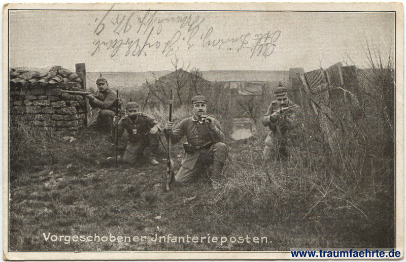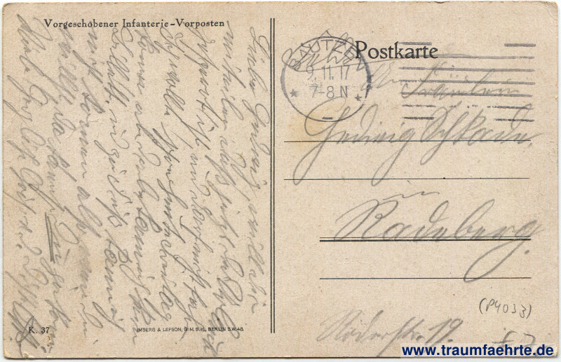 – Details – Jahr: ca. 1915 Status: gelaufen ohne Briefmarke (Feldpost), 1917 Beschriftung vorne: Vorgeschobener Infanterieposten. Beschriftung hinten: Postkarte, Vorgeschobener Infanterie-Vorposten, K. 37, Imberg & Lefson, G.M.B.H, Berlin S. W. 48. Stempel: Bautzen, * *, 9.11.17, 7–8 N. Hinweis: