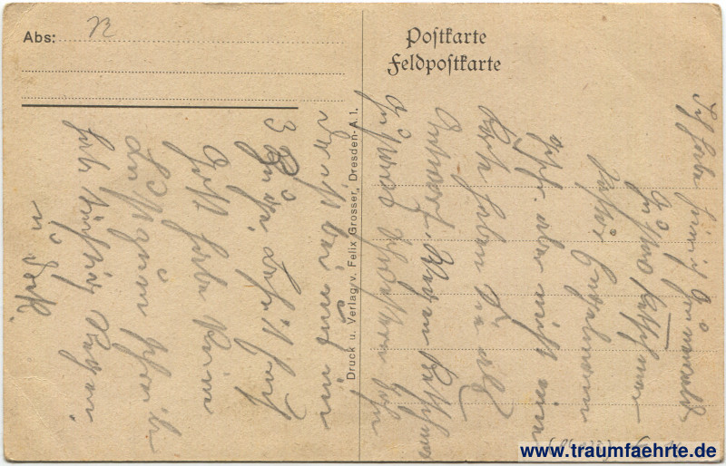 – Details – Jahr: ca. 1915 Status: ungelaufen Beschriftung vorne: Im Schützengraben I: Offizier, Reservemann und Rekrut, / halten, die Heimat in treuer Hut, / Sind alle aus deutschem Holze geschnitten, / werden vom Teufel nicht nieder gestritten. G. v. d. Gabelentz, Der sogenannte Trichter im Schürzengraben, O. Bahls, Dresden 19. Beschriftung hinten: Postkarte, Feldpostkarte, Abs.: … Druck u. Verlag v. Felix Grosser, Dresden-A. 1. Stempel: keine Hinweis: