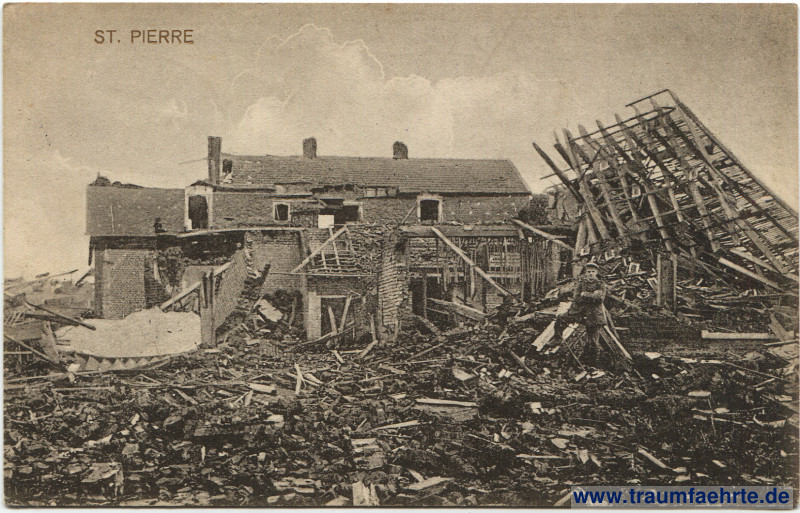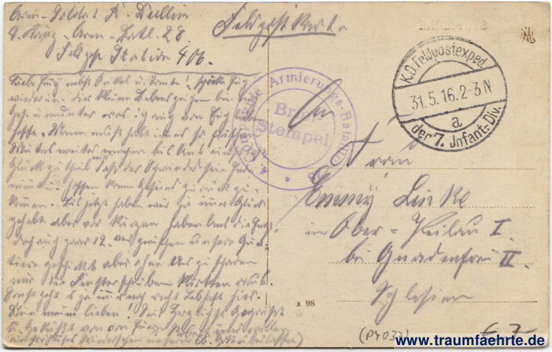 – Details – Jahr: ca. 1915 Status: gelaufen ohne Briefmarke (Feldpost), 1916 Beschriftung vorne: St. Pierre Beschriftung hinten: x 98 Stempel: K. D. Feldpostexped. der 7. Infant.-Div., a, 31.5.16. 23 N; Brief-Stempel, *, Compagnie Armierungs-Battailon 28 Hinweis: