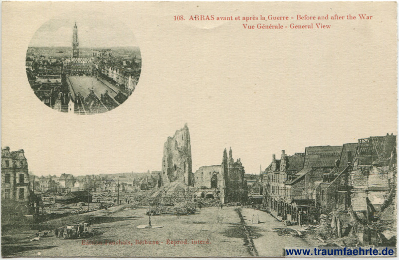 Beschriftung vorne: 108. Arras avant et après la Guerre – Before and after the War, Vue Générale – General View, Edition Fauchois, Béthune – Reprod. interd.