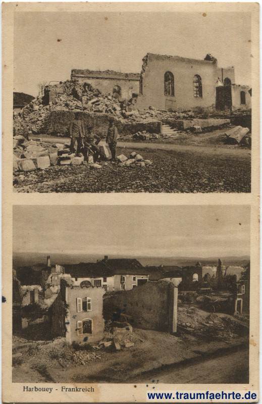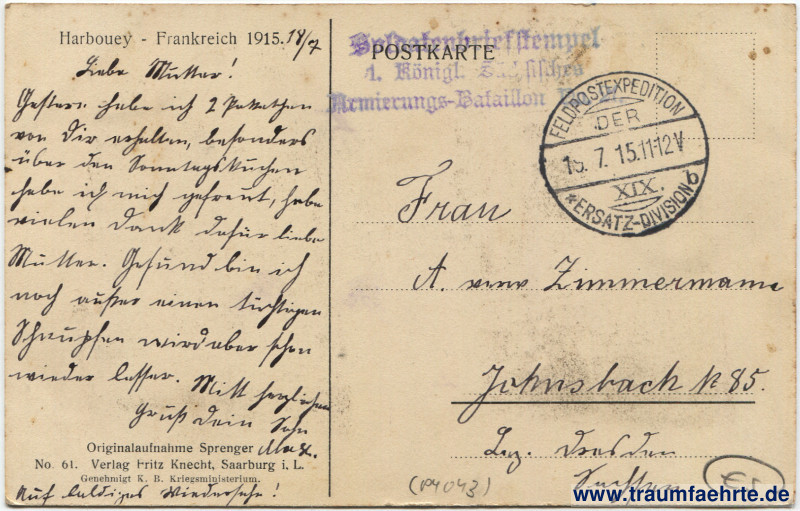 – Details – Jahr: 1915 Status: gelaufen ohne Briefmarke (Feldpost), 1915 Beschriftung vorne: Harbouey – Frankreich Beschriftung hinten: Postkarte, Harbouey – Frankreich 1915. Originalaufnahme Sprenger, No. 61. Verlag Fritz Knecht, Saarburg i. L. Genehmigt K. B. Kriegsministerium. Stempel: Feldpostexpedition der XIX. Ersatz-Division, b, 15.7.15. 11–12 V; Soldatenbriefstempel, 1. Königl. Sächsisches Armierungs-Bataillon No. 21 Hinweis: