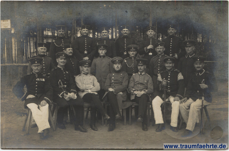 monochrome photograph – group photograph of unknown soldiers in uniform and with hats, partly sitting and with sabres, forest in background; stamped at Königsbrück military training area