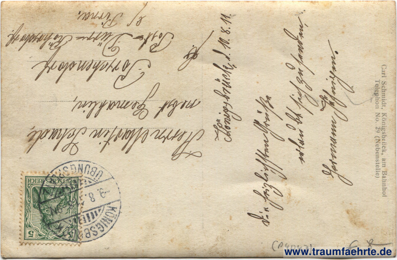 Inscription back: Carl Schmidt, Königsbrück, am Bahnhof, Telephon No. 29 (Nebenstelle)