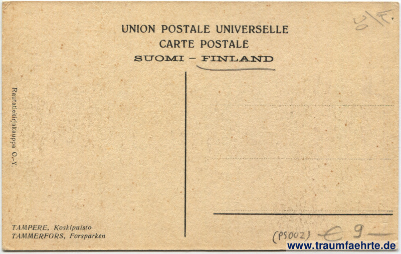 – Details – Jahr: ca. 1910 Status: ungelaufen Beschriftung vorne: kein Text Beschriftung hinten: Union postale universelle, Carte postale, Suomi – Finland, Tampere, Koskipuisto, Tammerfors, Forsparken, Rautatiekirjakauppa O.-V. Stempel: keine Hinweis: