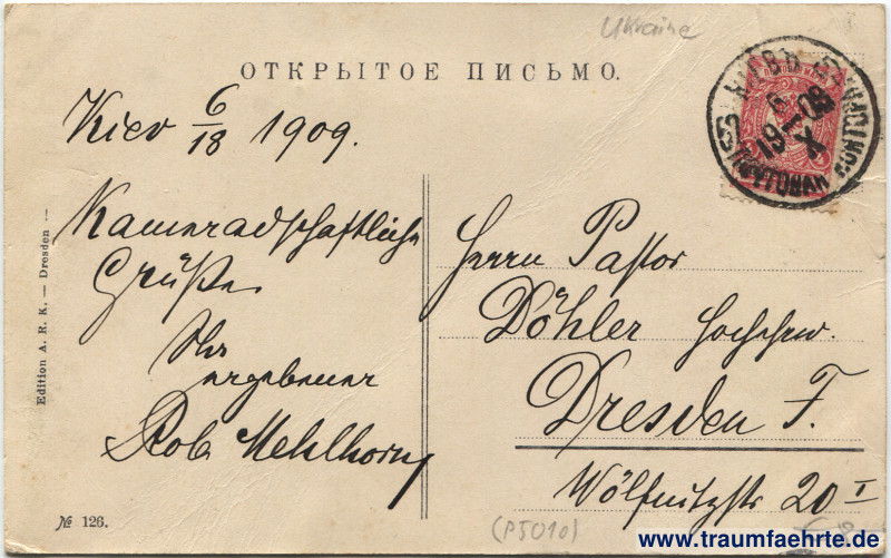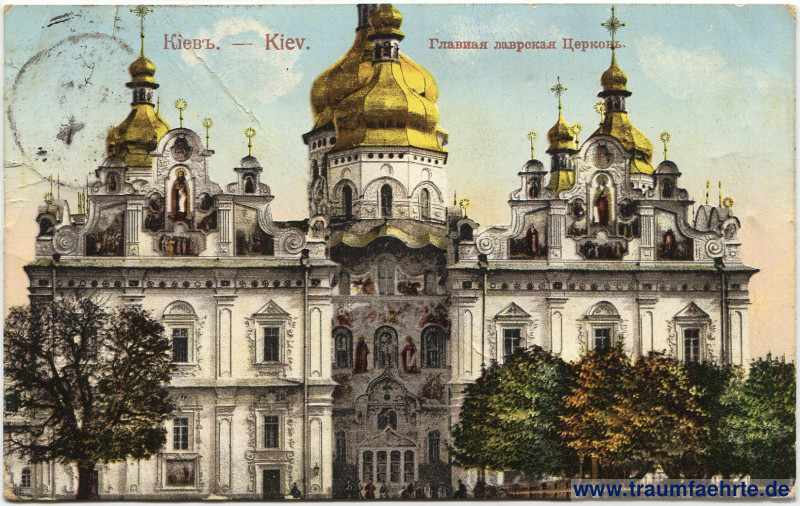 – Details – Jahr: ca. 1905 Status: gelaufen 1909 Beschriftung vorne: Кіевъ. – Kiev. Главиая лавсрская Церковь. Beschriftung hinten: Открытое Письмо. No. 126. Edition A. R. K. – Dresden – Stempel: Кіевъ, Почтован[…] контора, 19 6 09 X Hinweis: