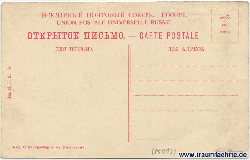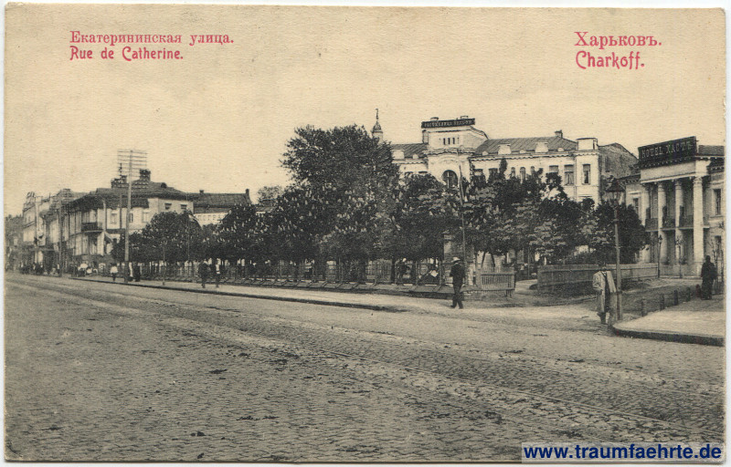 – Details – Jahr: ca. 1915 Status: ungelaufen Beschriftung vorne: Екатерининская улица. Rue de Catherine. Харковъ. Charkoff. Hotel Хастъ […] Beschriftung hinten: Всемірный почтовый союзъ. Россия. Union postale universelle Russie. Открытое письмо. – Carte postale. для письма, для адреса, Акц. О:во Гранбергъ въ Стокгольмѣ. Изд. И. Д. П. 39, Мѣсто для марки Stempel: keine Hinweis: